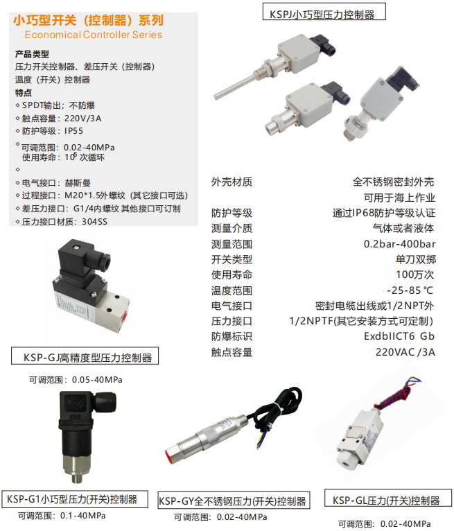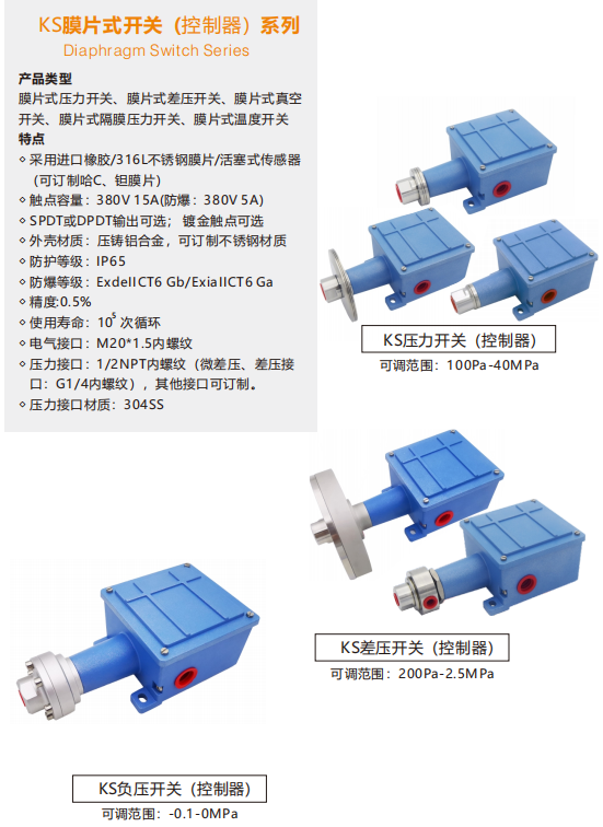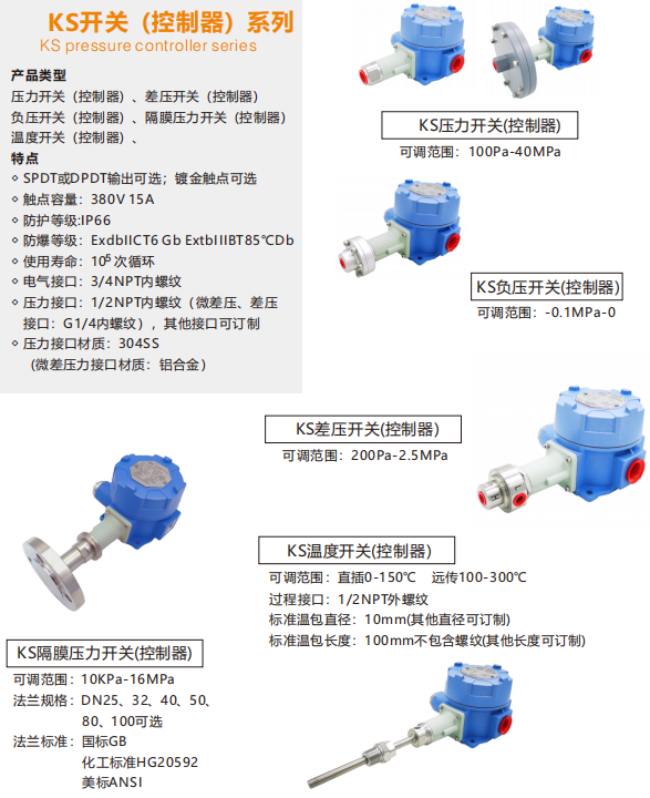公司“KFT”品牌产品定位于过程控制仪表行业的中端及高端产品,以高性能、高标准、高服务及高竞争力的价格等特点,已被广泛用于火电、核电、化工、冶金、液压、航空、制药、环保、造纸、锅炉、水务等行业;公司主营产品有:机械式压力、差压、负压、温度开关(控制器),智能压力、差压、温度、液位变送器,智能压力、温度、流量、液位开关等。