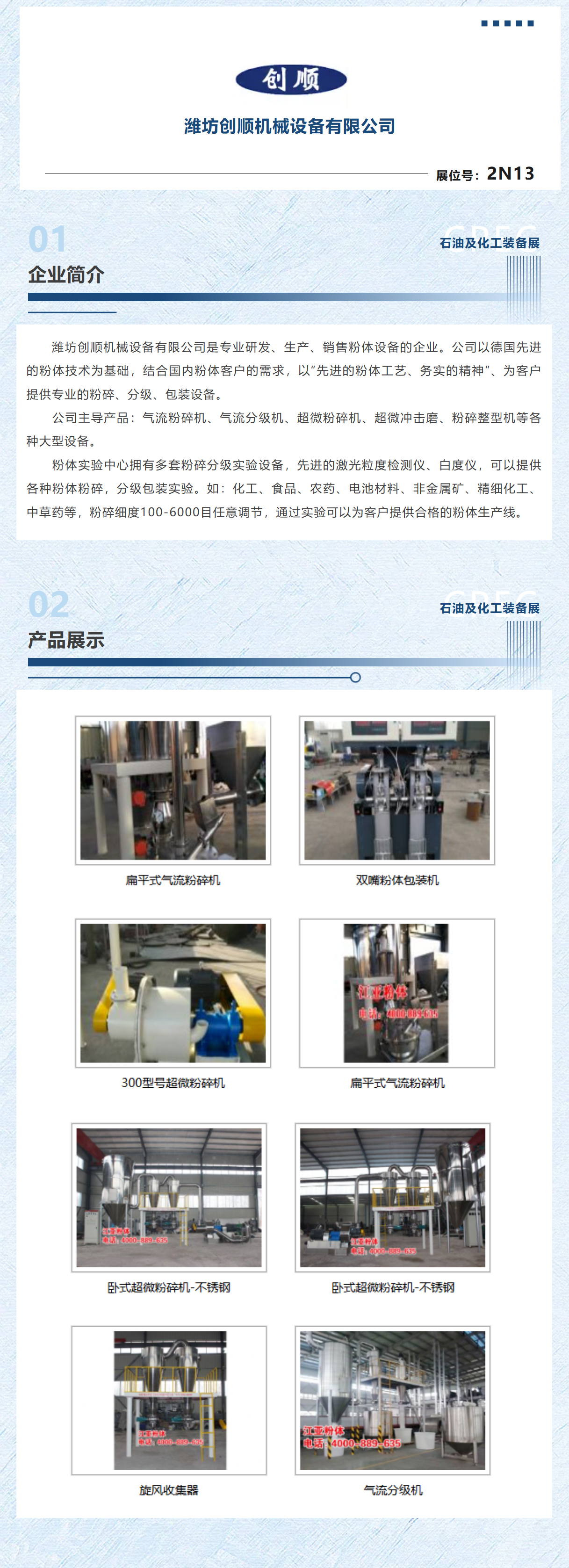 潍坊创顺机械设备有限公司是专业研发、生产、销售粉体设备的企业。公司以德国先进的粉体技术为基础,结合国内粉体客户的需求,以“先进的粉体工艺、务实的精神”、为客户提供专业的粉碎、分级、包装设备。